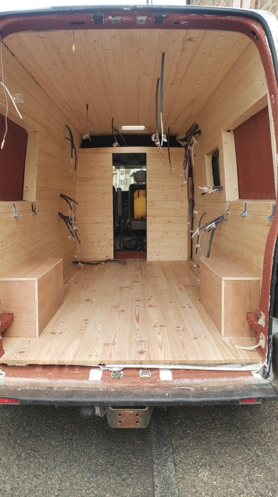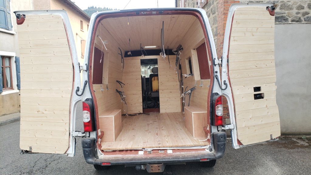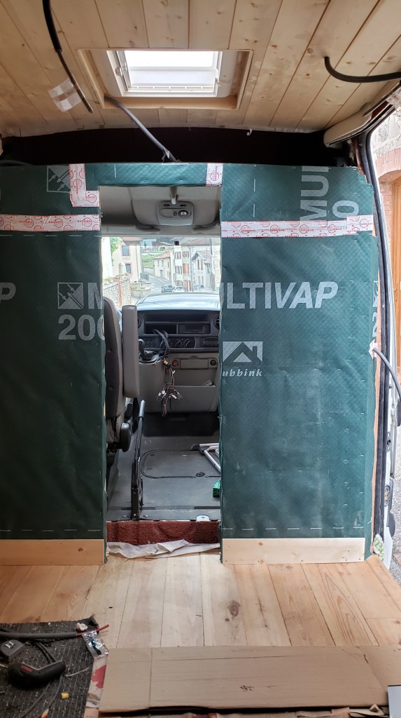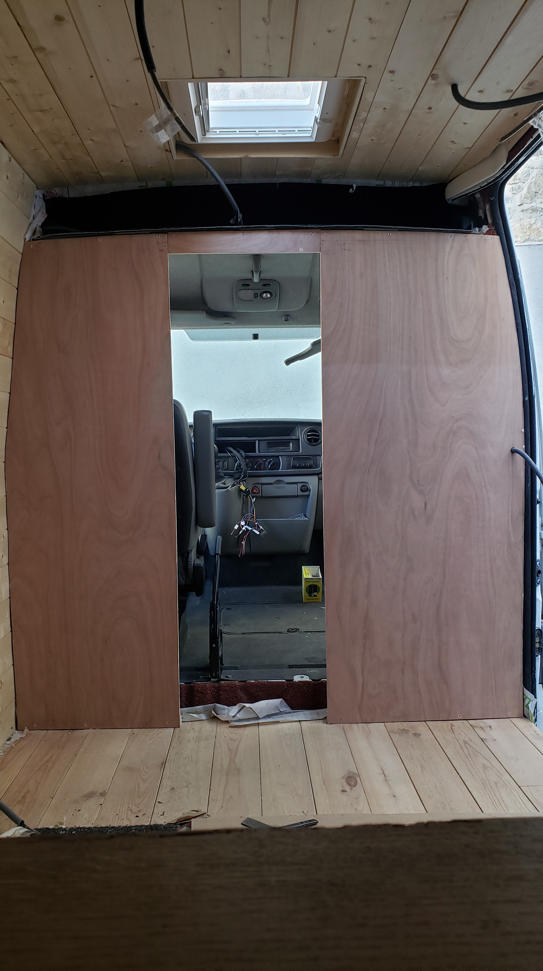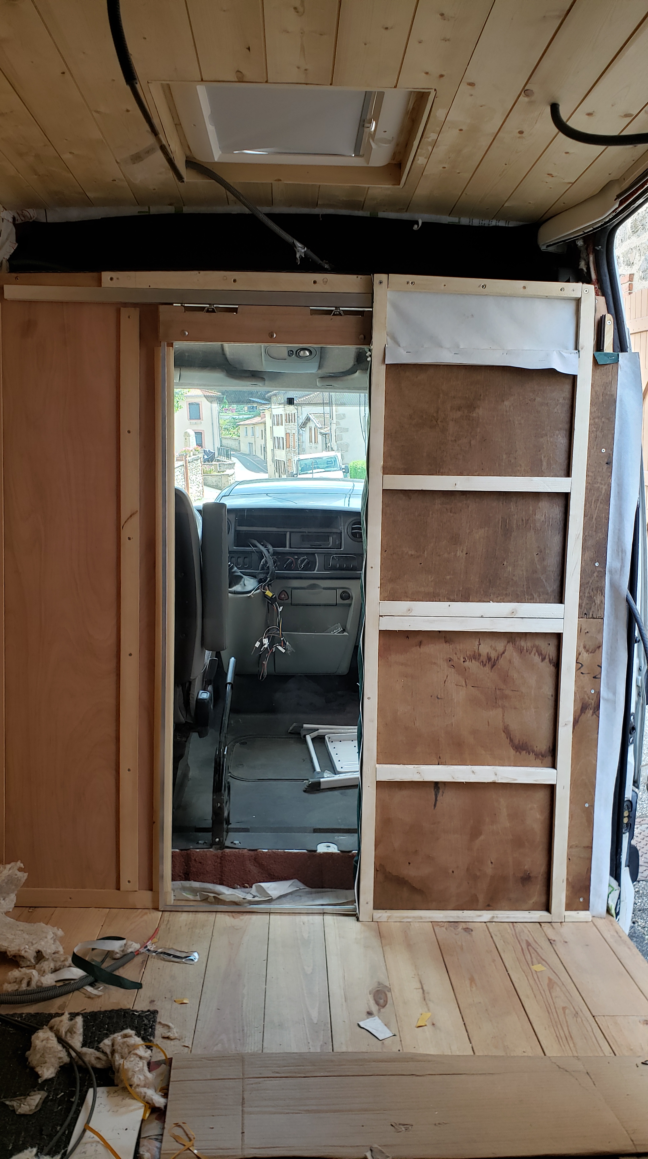 Je vais préparé la cloison pour poser du lambris une fois que la laine sera en place. Encore pas mal de corrections à faire vu que j’ai tout fait parfaitement dans le fourgon.