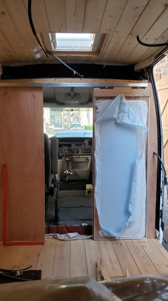 D’un point de vue pratique ca m’évitera de m’appuyer sur la porte quand je veux passer à l’avant du véhicule. Le second point est qu’une cloison de cette épaisseur va aussi me servir à isoler cette section du fourgon même si evidemment la porte ne pourra pas être isoler quand elle sera fermé. Il faudra donc que je créer un rideau isolant pour limiter la perdition de chaleur. Le principe de la porte coulissante à ma façon est très perfectible car ca laisse des espaces sans isolation .. ou l’air circule librement mais c’est aussi le cas pour le lanterneau et l’aération basse.