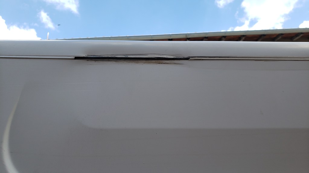 Lors de ma première fuite j’avais laissé de coté la réparation d’un joint abimé sur le toit pour plus tard. Mais j’en ai marre de démonter le lambris donc j’ai repris tous les joints du toit et aussi quelques uns sur la partie haute des cotés.