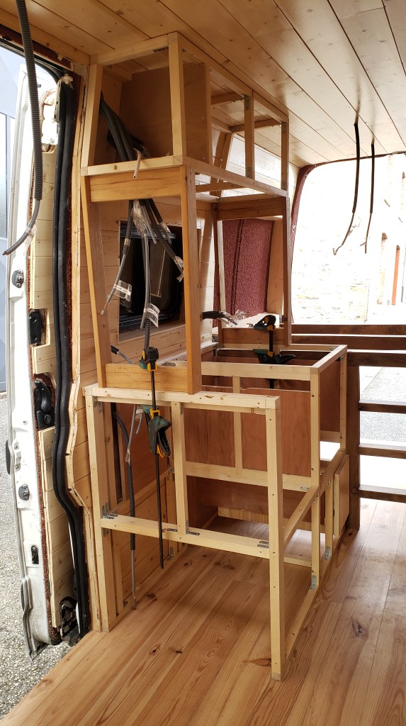 C’est le moment de fixer les meubles dans le fourgon. Vu que j’ai fait un excellent boulot à niveler le plancher et que les murs sont bien droits … j’ai le droit de caler en dessous et derrière mes créations.