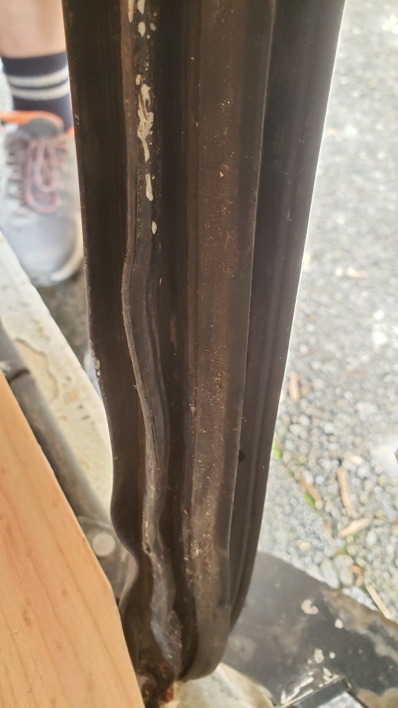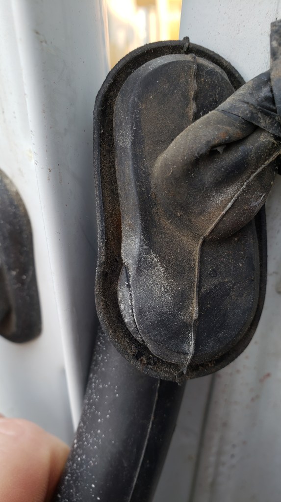 Allez je reprends l’habillage mais vu que quand je commence à progresser …. je découvre une autre fuite qui est complètement ma faute mais celle là va m’obliger de démonter le coffre du passage de roue. J’ai mal remonté le caoutchouc qui permet de fournir l’électricité à la porte arrière . Ca m’a trempé pas mal de laine … ah ca faisait un moment que j’avais pas perdu du temps.