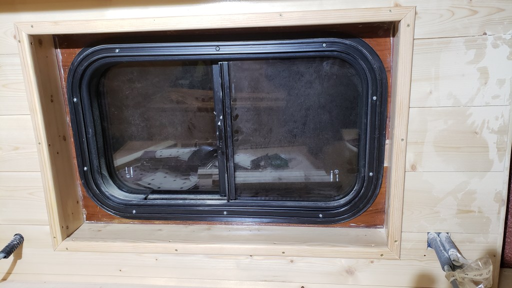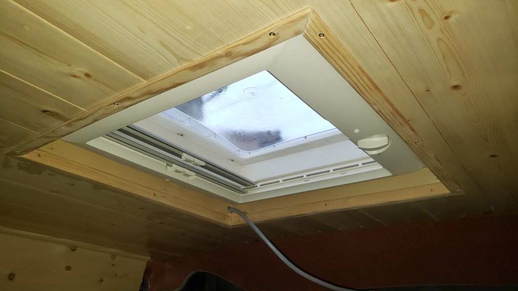 J’ai pris quelques heures pour faire le contour de ma porte coulissante, de la fenetre et du lanterneau mais aussi du lit avec des baguettes d’angle.