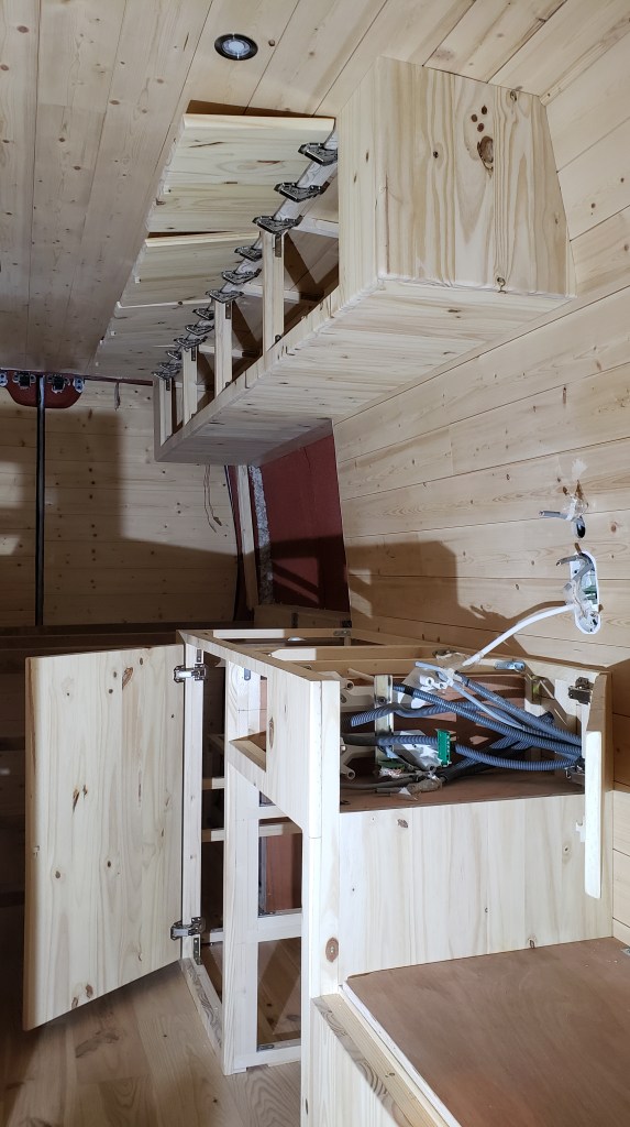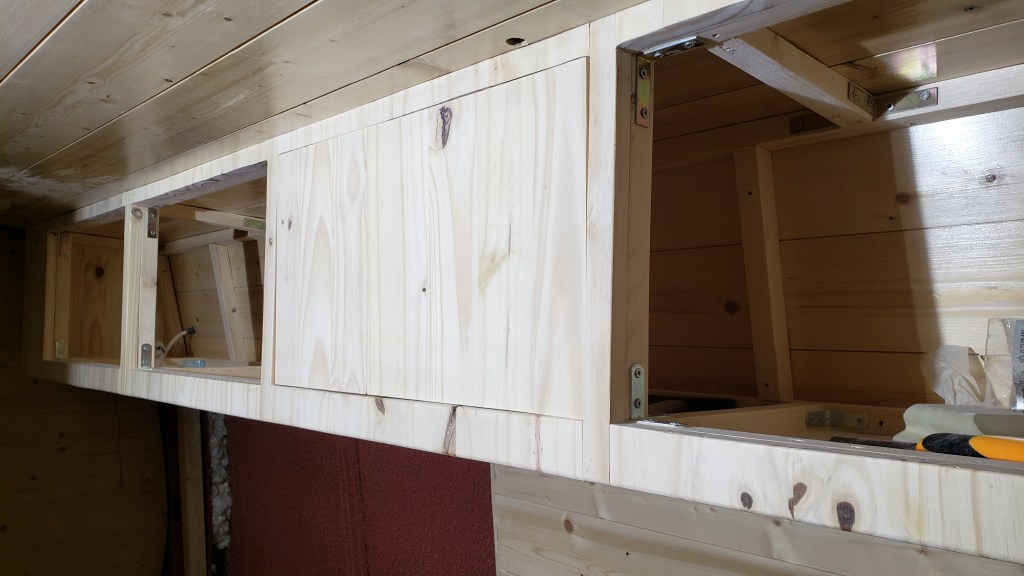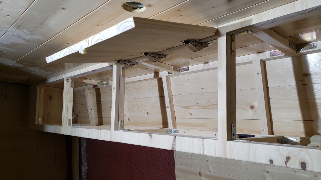 Je ne peux pas faire des meubles sans créer des placards en hauteur. Le premier sera au dessus de la cuisinière, il aura une zone réservée aux boites de dérivation car je préférais avoir des options de raccordements de ce coté du fourgon. Ce placard n’est que sur la zone couverte par le meuble ‘cuisinière’ car je ne veux pas de rangement au dessus de ma tête au niveau du lit.