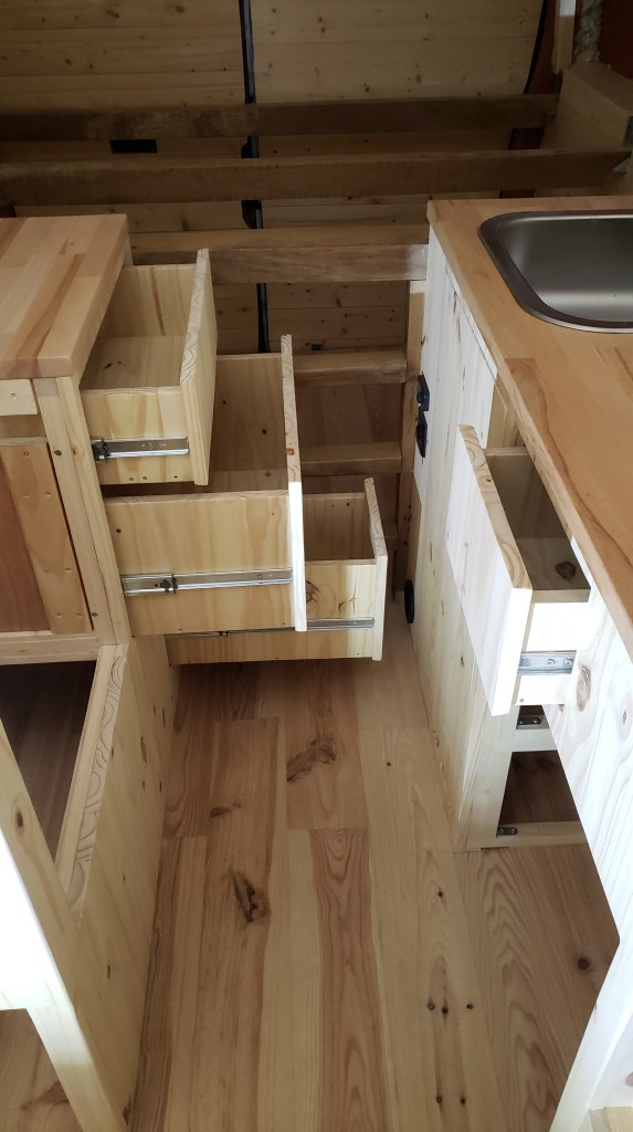 Le système a l’avantage de ne pas nécessiter de verrou car le tiroir sera bloqué à la fermeture ; seulement une pression suffisante pourra déverouiller le tiroir. Comme tout ce que fais dans le fourgon, je découvre l’installation de ce type de coulisses en créant mes tiroirs.